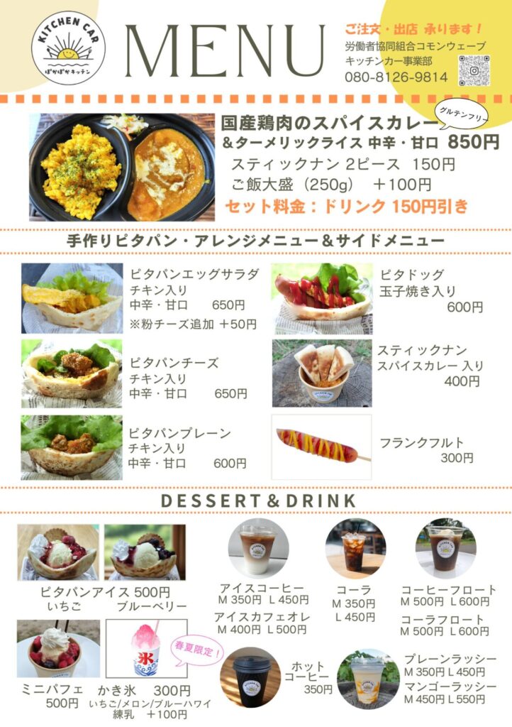 スパイスカレー、ピタパン各種、デザート、ドリンクで、30食以上の販売量を確保いただけると幸いです。
