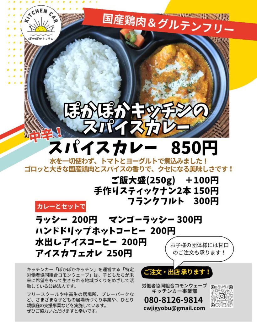 企業・団体様のランチ用に、ぽかぽかキッチンの名物「スパイスカレー」のご注文を承ります。