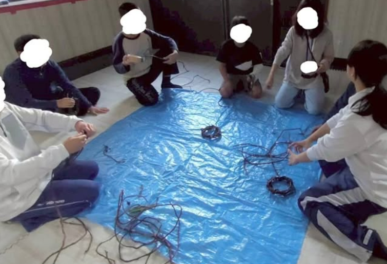低学年はスタッフがマンツーマンで付きながら新しいつるを継ぎ足し、絡めていきます。