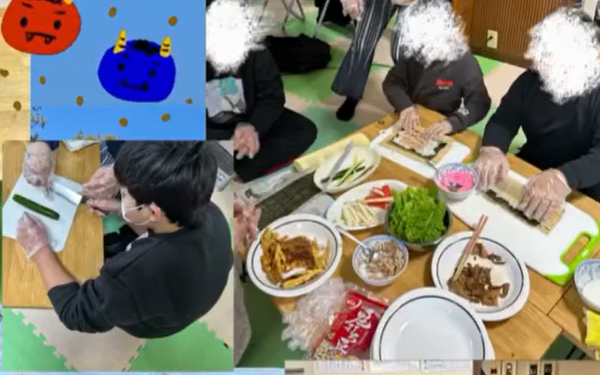 ピンポン玉を投げるユニークな豆まき、そしてオリジナル恵方巻風のり巻きづくり。「これまで食べなかった食材に自分から挑戦する子が出現!」「大豆をすり潰してきな粉づくり」など、食卓では創意工夫の連続。子どもたちの「やってみたい!」という気持ちが、一番のスパイスです✨